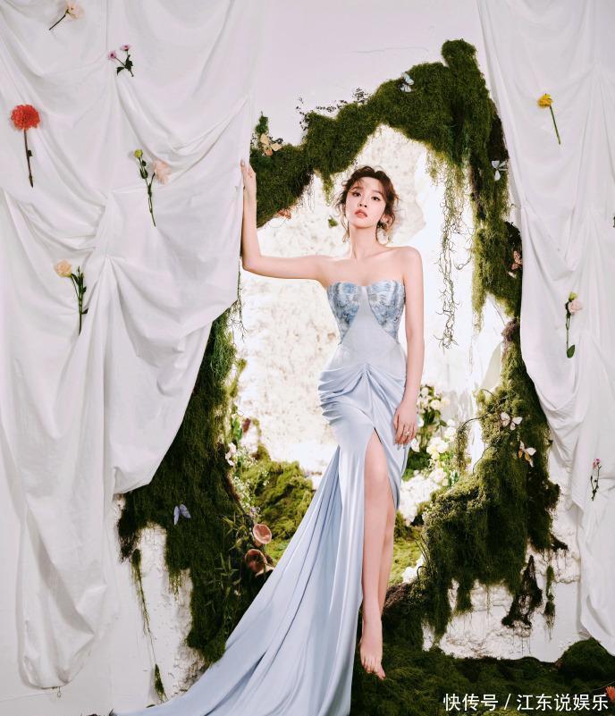 生日造型解析:仙气值拉满:渐变水蓝长裙如晴空晕染,抹胸处精致刺绣似揉碎星光,高开叉设计秀出绝美腿线